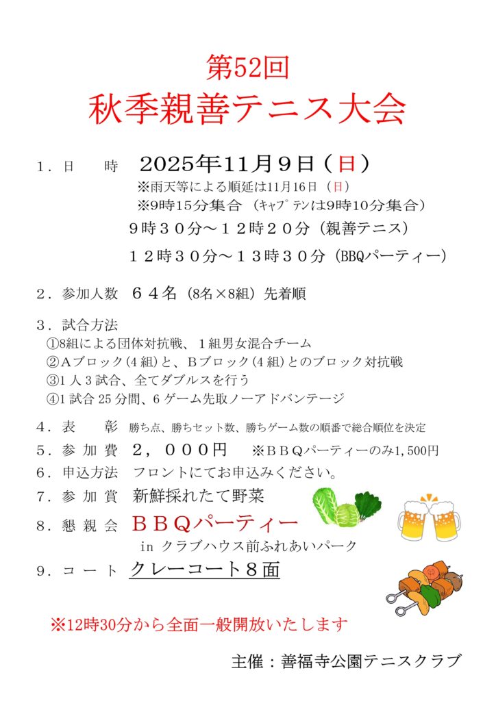 このたび「第52回 秋季親善テニス大会」を下記の通り開催いたします。