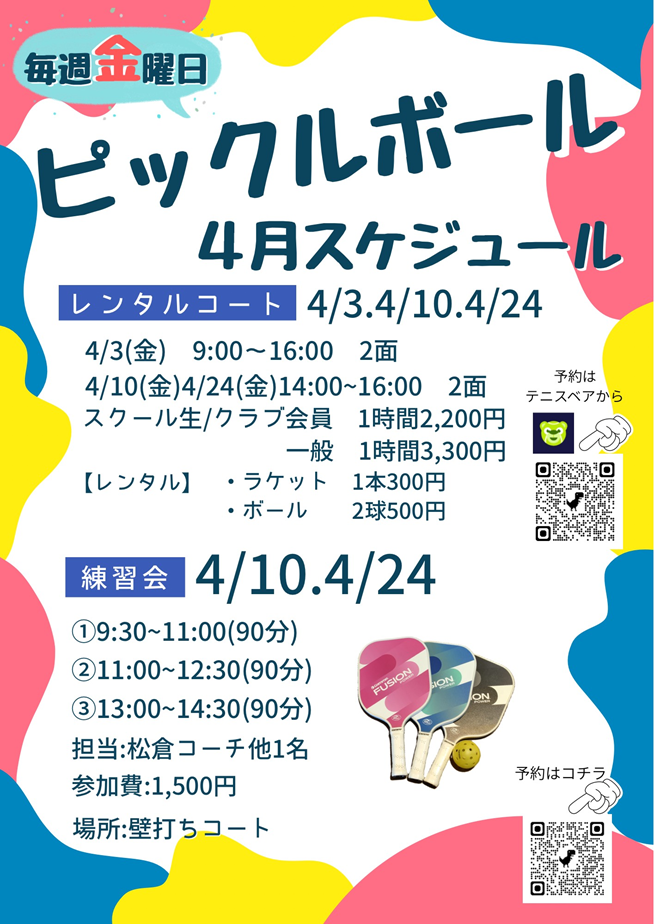 体験後にお友達とプレーしたい方にもおすすめです。 ピックルボールの仲間を増やして、是非ご参加ください!
